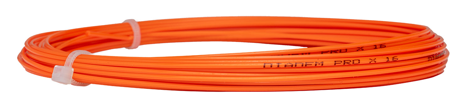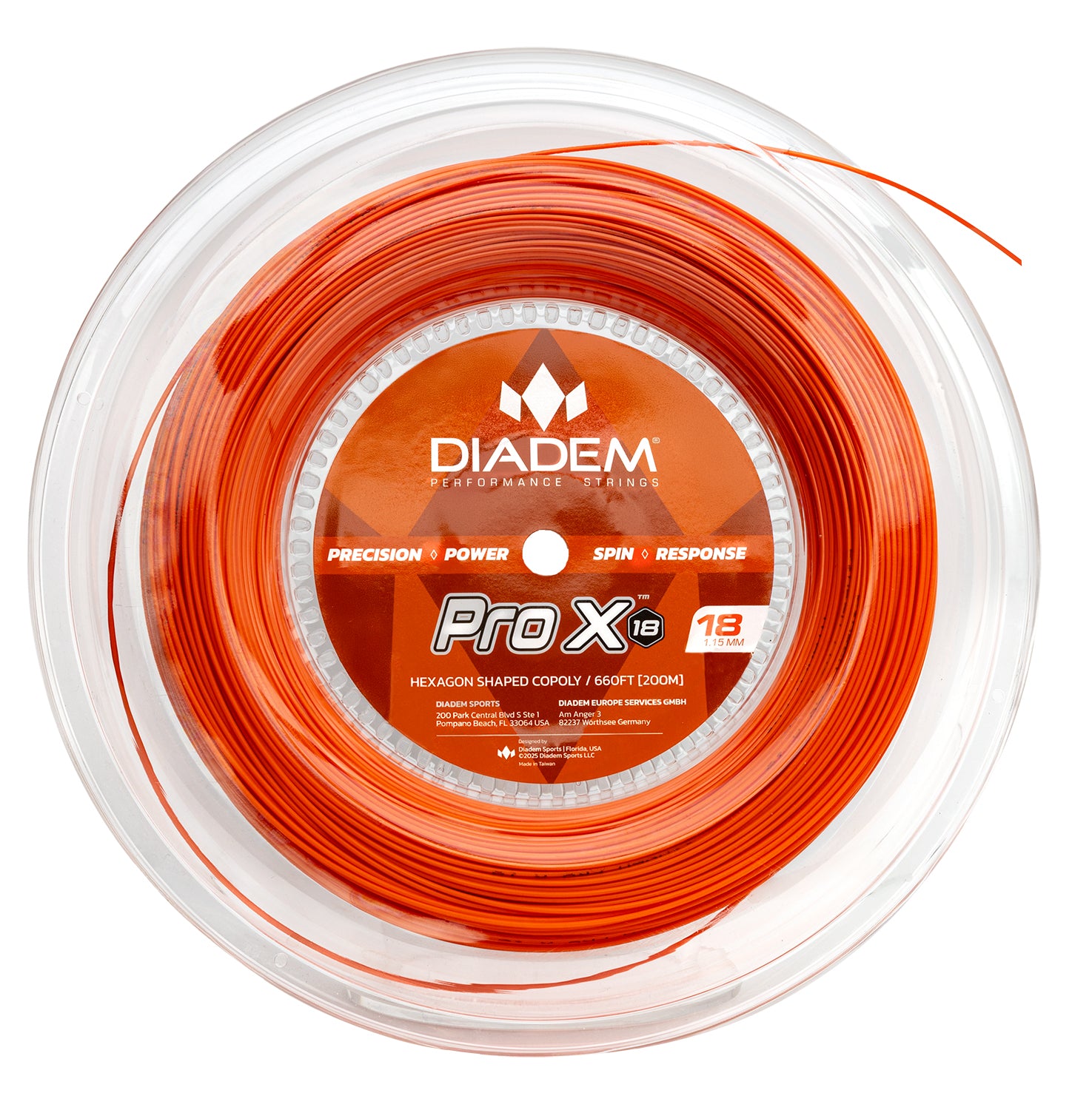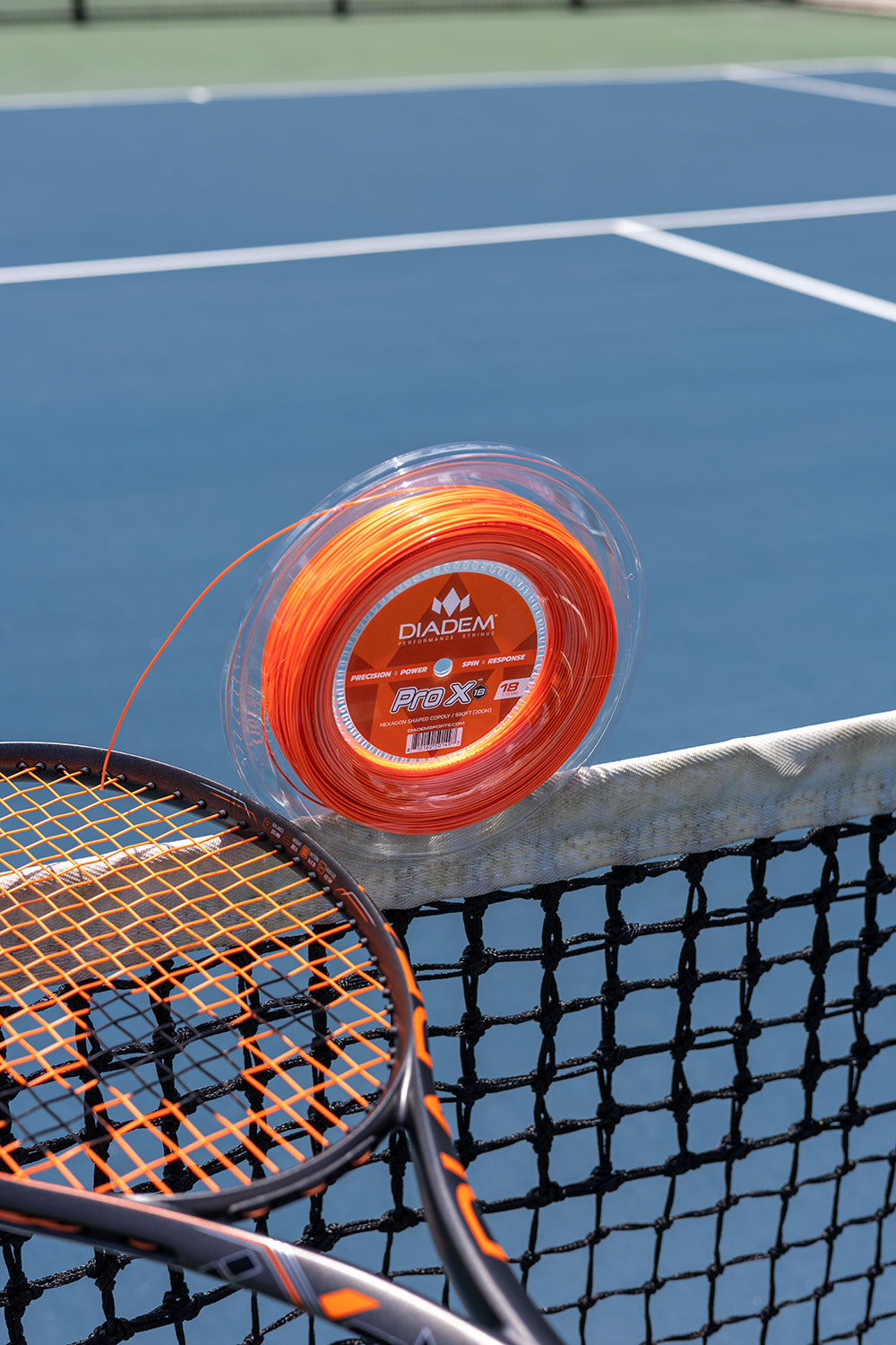 Diadem Pro X is the most powerful and firm option for a string in the Diadem line. Designed with the help of current pro tennis players, this poly string is designed to provide a stiffer option than the Flash string, with a hexagon cross-section. The firmness results in an explosive response off the string bed with adequate spin production from the edged shape.